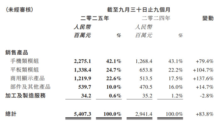 平板類模組營收 13.384 億元,同比增長 104.7%,占總營收 24.7%;