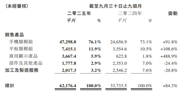 手機類模組:銷量 47.3 百萬片(47298.8 千片),同比大增 91.8%,占總銷量比重 76.1%,仍是核心營收來源;