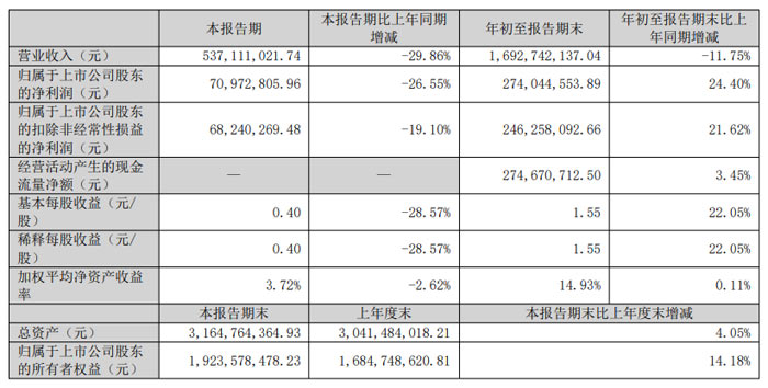 營(yíng)收方面:本報(bào)告期(三季度單季)公司實(shí)現(xiàn)營(yíng)業(yè)收入 5.37 億元,較上年同期下降 29.86%;年初至報(bào)告期末累計(jì)營(yíng)業(yè)收入 16.93 億元,同比下降 11.75%。