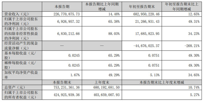 2025 年第三季度公司實(shí)現(xiàn)營業(yè)收入 2.27 億元,較上年同期增長 14.48%;歸母凈利潤 692.7 萬元,同比大幅增長 65.38%,盈利能力顯著提升。