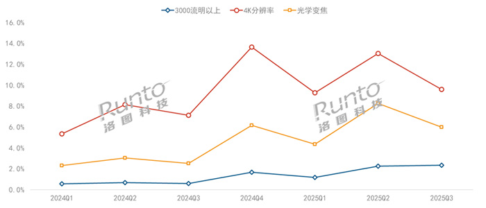 光學(xué)技術(shù)方面,2025年第三季度,變焦產(chǎn)品的銷(xiāo)量占比達(dá)到6.0%,較2024年同期上漲2.5個(gè)百分點(diǎn);銷(xiāo)額占比則達(dá)到了23.4%,同比大漲16.3個(gè)百分點(diǎn)。