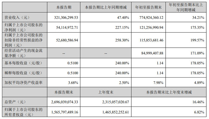 2025 年 1-9 月,累計(jì)實(shí)現(xiàn)營業(yè)收入42.20 億元,較上年同期的 22.78 億元同比增長 85.27%。歸母凈利潤55700 萬元,較上年同期的 27152 萬元同比增長 105.14%。