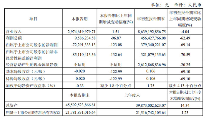 前三季度業(yè)績(2025 年 1-9 月),累計(jì)實(shí)現(xiàn)營收 27.04 億元,較上年同期的 36.27 億元下降 25.47%。累計(jì)歸屬上市公司股東的凈利潤為 - 91251.83 萬元,較上年同期的 16742.26 萬元下降 645.04%。累計(jì)扣非凈利潤為 - 92869.57 萬元,較上年同期的 11633.19 萬元下降 798.32%。基本每股收益:前三季度基本每股收益 - 3.74 元,較上年同期的 0.81 元下降 561.73%。