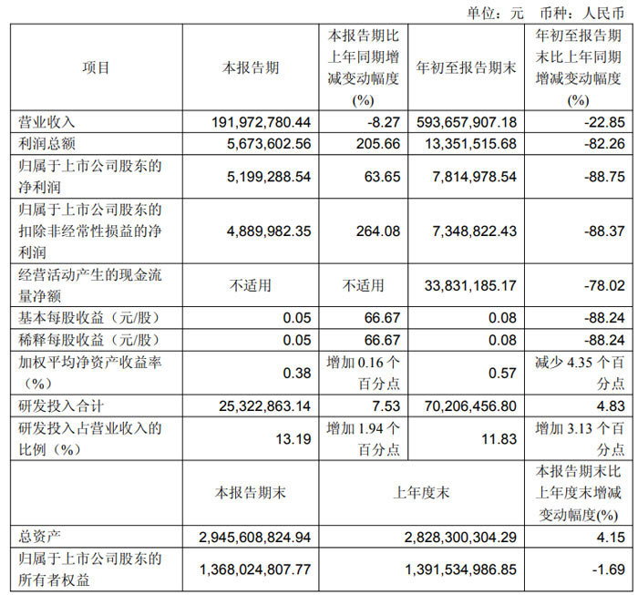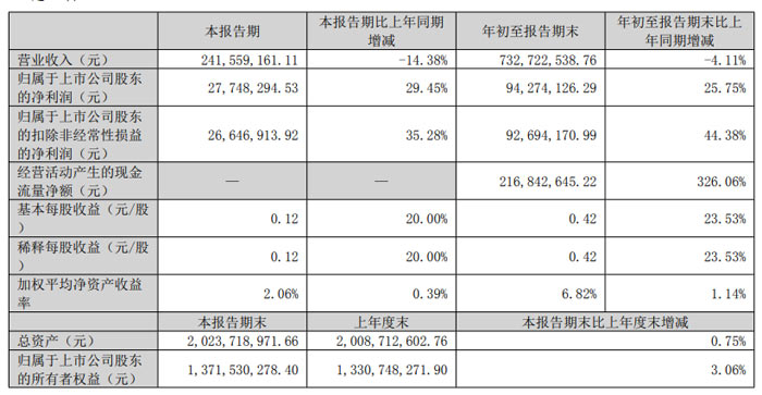 年初至報(bào)告期末,公司營業(yè)收入為 73272.25 萬元,較上年同期的 76412.67 萬元下降 4.11%;歸母凈利潤 9427.41 萬元,較上年同期的 7496.68 萬元增長 25.75%;扣非凈利潤 9269.42 萬元,同比大幅增長 44.38%;基本每股收益 0.42 元,同比增長 23.53%。