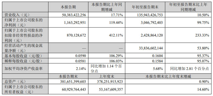 2025 年 1-9 月,公司累計(jì)實(shí)現(xiàn)營業(yè)收入 273.01 億元,較上年同期調(diào)整后的 205.32 億元增長 32.97%;累計(jì)歸母凈利潤為 513,034.26 萬元,較上年同期調(diào)整后的 446,778.52 萬元增長 14.83%。