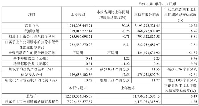 2025 年第三季度,公司實(shí)現(xiàn)營業(yè)收入 12.44 億元,較上年同期的 9.55 億元增長 30.28%;歸母凈利潤 28599.67 萬元,較上年同期的 28803.27 萬元小幅下降 0.71%。