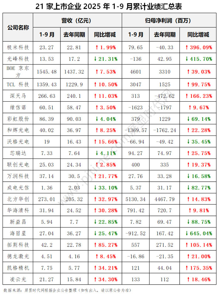 極米、光峰、京東方、TCL、維信諾、深天馬、彩虹股份、北方華創(chuàng)等21家投影、面板、LED與半導(dǎo)體顯示企業(yè)Q3財(cái)報(bào)業(yè)績匯總