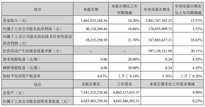 2025 年 1-9 月,公司累計實現(xiàn)營業(yè)收入 28.82 億元,同比增長 13.51%;歸屬于上市公司股東的凈利潤 1.78 億元,同比增長 3.52%;歸屬于上市公司股東的扣除非經(jīng)常性損益的凈利潤 1.68 億元,同比增長 16.43%。基本每股收益 0.24 元,同比增長 4.35%;加權(quán)平均凈資產(chǎn)收益率 3.76%,較上年同期上升 0.26 個百分點。​