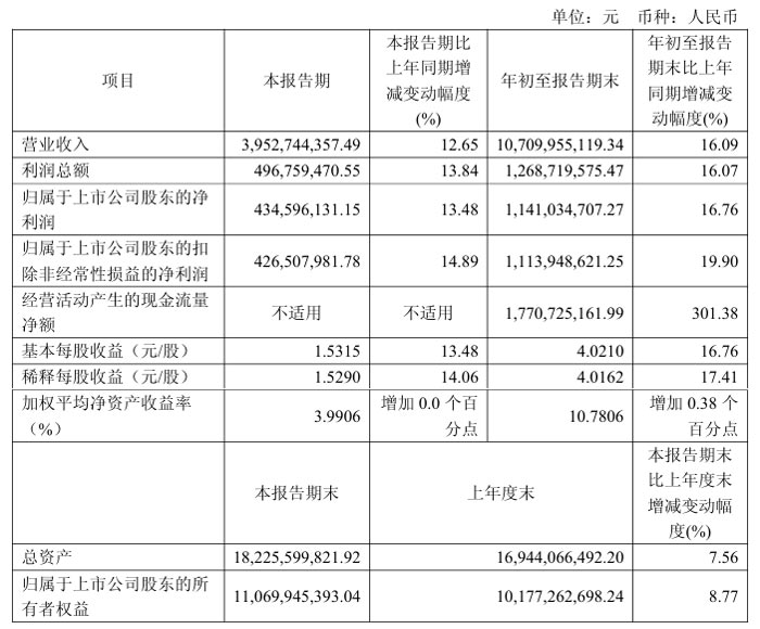 此外,公司前三季度基本每股收益為 4.0210 元 / 股,較上年同期的 3.4437 元 / 股增長 16.76%;稀釋每股收益為 4.0162 元 / 股,較上年同期的 3.4206 元 / 股增長 17.41%,股東回報進一步提升。