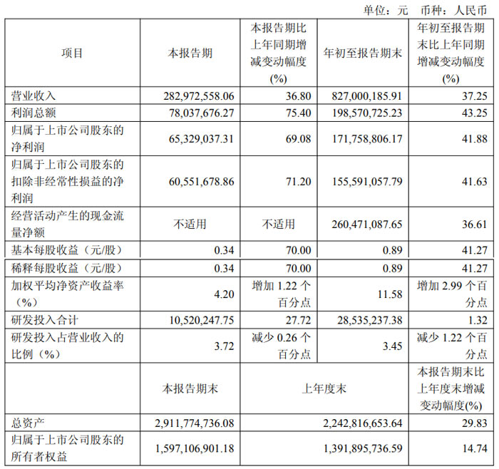 2025 年 1-9 月,公司營業(yè)收入達(dá)到 8.27 億元,較上年同期的 6.03 億元增長(zhǎng) 37.25%;歸屬于上市公司股東的凈利潤 1.72 億元,較上年同期的 1.21 億元增長(zhǎng) 41.88%;歸屬于上市公司股東的扣除非經(jīng)常性損益的凈利潤 1.56 億元,較上年同期的 1.10 億元增長(zhǎng) 41.63%。