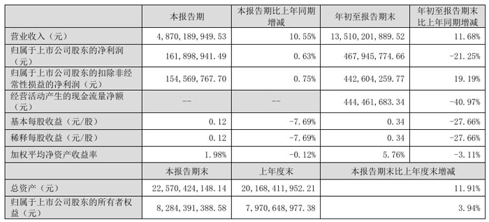 前三季度,公司實(shí)現(xiàn)營(yíng)業(yè)收入 135.10 億元,同比增長(zhǎng) 11.68%;其中單季度營(yíng)業(yè)收入 48.70 億元,同比增長(zhǎng) 10.55%,營(yíng)收增長(zhǎng)勢(shì)頭持續(xù)。利潤(rùn)方面,前三季累計(jì)歸屬于上市公司股東的凈利潤(rùn) 4.68 億元,同比下降 21.25%;但扣除非經(jīng)常性損益后的凈利潤(rùn)達(dá) 4.43 億元,同比大幅增長(zhǎng) 19.19%,核心盈利能力顯著增強(qiáng);久抗墒找 0.34 元,同比下降 27.66%;加權(quán)平均凈資產(chǎn)收益率為 5.76%。第三季度單季度實(shí)現(xiàn)歸母凈利1.61億元,同比微增0.63%。