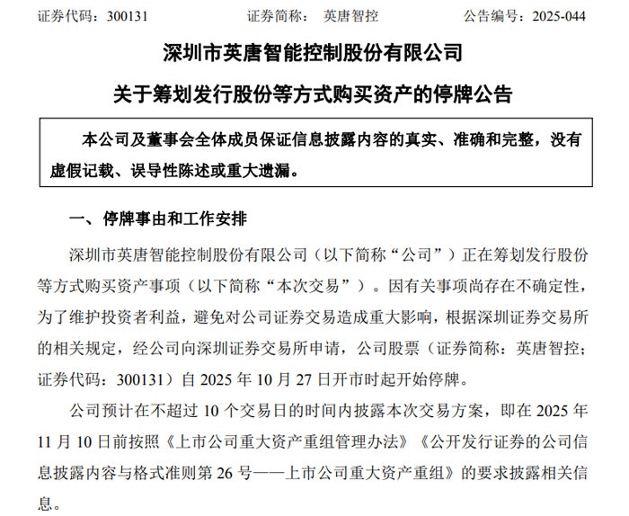 根據(jù)公告,為保證公平信息披露,維護(hù)投資者利益,避免公司股價(jià)異常波動(dòng),經(jīng)向深圳證券交易所申請(qǐng),公司股票自 2025 年 11 月 3 日(星期一)開(kāi)市起停牌,預(yù)計(jì)停牌時(shí)間不超過(guò) 2 個(gè)交易日。