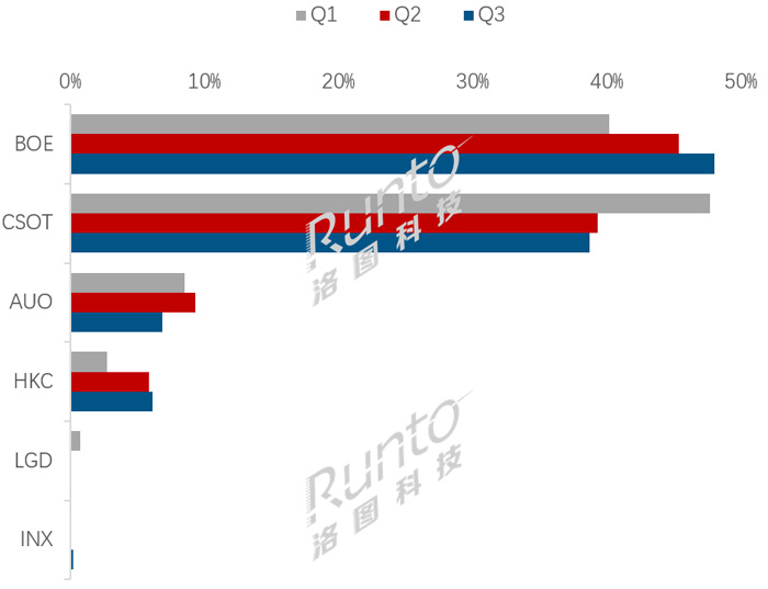 根據(jù)洛圖科技(RUNTO)數(shù)據(jù)顯示,2025年第三季度的表現(xiàn)尤為突出,當季中國大陸三家主要面板廠(BOE、CSOT、HKC)在全球市場的出貨量合并市占率為92.9%,比2024年同期增長了9.9個百分點。前三季度累計來看,市占率達91.5%,同比提升7.1個百分點。