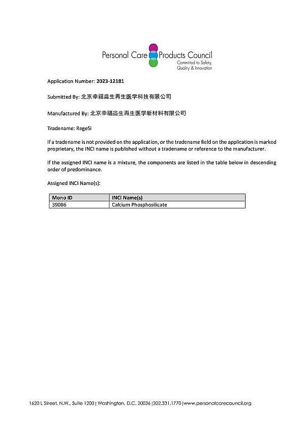 2024年,RegeSi®再生醫(yī)學新材料獲國際化妝品原料(INCI)認可,賦予標準名稱 “Calcium Phosphosilicate(磷硅酸鈣)”。作為全球化妝品行業(yè)的 “通用語言”,該編碼讓“磷硅酸鈣”可無縫融入歐美、日韓等全球美妝品牌的配方研發(fā)、標簽合規(guī)環(huán)節(jié),正式開啟國際美妝原料市場布局。