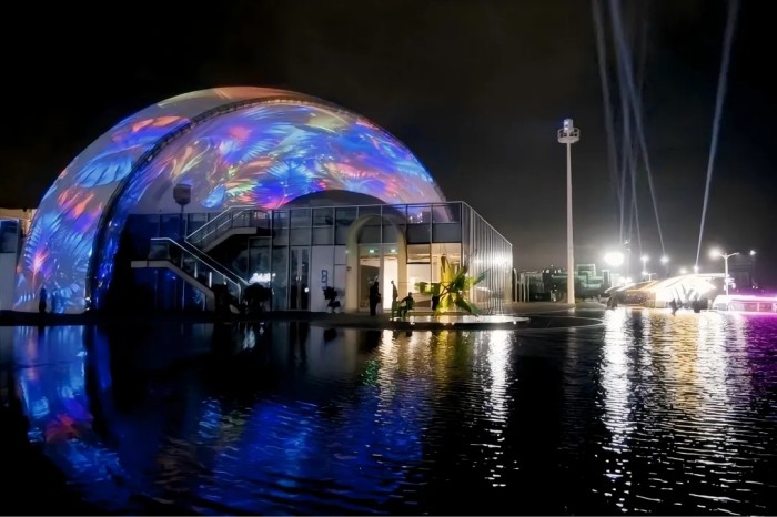 藝術(shù)展現(xiàn)場(chǎng)的標(biāo)志,是一座跨度38米的雙層球幕穹頂建筑,這是國(guó)內(nèi)已知直徑最大的雙層球幕穹頂,視美樂通過呈現(xiàn)全環(huán)繞光影視覺,創(chuàng)造了國(guó)內(nèi)球幕投影領(lǐng)域的新紀(jì)錄。站立其中,仿佛置身于無邊宇宙,從色彩奇境到浩瀚星河,每一幀畫面都帶來震撼心靈的沉浸體驗(yàn)與藝術(shù)感受。