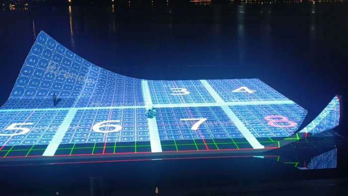 本次項目共部署78臺巴可UDX-4K40,其中,54臺部署于舞臺正面位置,投射面積達(dá)40米x40米的完整舞臺地面影像。兩側(cè)分別部署了12臺進(jìn)行側(cè)面補光,在舞臺“卷角”與“積木”升起時的立面上覆蓋動感影像,使整個水中“紙舞臺”的視覺效果渾然一體。巴可UDX-4K40亮度高達(dá)43000流明,憑借業(yè)界領(lǐng)先的寬色域和紅色表現(xiàn)力,精準(zhǔn)還原了代表民族精神的“中國紅”以及歌舞表演中豐富的色彩。