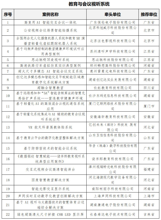 “教育與會議視聽系統(tǒng)” 為分類標(biāo)識,案例涵蓋教育場景(如數(shù)字化教室、智慧教室)與會議場景(如智能會議系統(tǒng)、混合云視訊通信系統(tǒng))。包括惠州雷曼光電科技有限公司的“超大尺寸多模態(tài) AI 智能會議交互系統(tǒng)”、長虹教育科技有限公司的“超融合智慧教室”、廣東保倫電子股份有限公司的“高復(fù)用 AI 智能交互會議一體機 ”、廈門億聯(lián)網(wǎng)絡(luò)技術(shù)股份有限公司的“基于輕量化 AI 的高效混合云視訊通信系統(tǒng)應(yīng)用”、長春希達(dá)電子技術(shù)有限公司的“綠色超高清大尺寸拼接 COB LED 顯示屏”等共計32個。