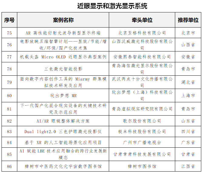 “近眼顯示和激光顯示系統(tǒng)”類案例集中于激光投影、 AR 終端、機載頭盔顯示等技術(shù)應(yīng)用。包括極米科技的“Dual light2.0 三色護眼激光投影儀 ”、青島海信激光顯示股份有限公司的“三色激光智能投影”、歌爾股份的“AI/AR 眼鏡整體解決方案”、安徽熙泰智能科技有限公司的“機載頭盔 Micro OLED 近眼顯示典型案例”等共計12個。