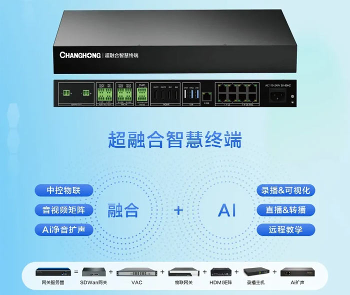 長虹教育科技推出的超融合智慧教室解決方案,以自主研發(fā)的超融合智慧終端為核心,整合中控物聯(lián)、AI 音視頻、云端運維等全場景能力,打造 “硬件集成 + 軟件協(xié)同 + 生態(tài)賦能” 的教育數(shù)字化新基座,為教室教學(xué)、管理與運維提供一站式解決方案,重新定義智慧教育應(yīng)用新范式。