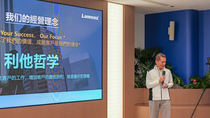 活動(dòng)在Lumens創(chuàng)始人——溫木榮先生的致辭中拉開(kāi)帷幕。溫總回顧了Lumens二十余年來(lái)深耕專(zhuān)業(yè)視聽(tīng)領(lǐng)域的歷程,并分享了公司始終秉持的“利他哲學(xué)”。“我們的使命,是全力支持與協(xié)助我們的渠道客戶(hù),簡(jiǎn)化他們的工作,增加他們的營(yíng)收獲利!睖乜倧(qiáng)調(diào),與伙伴共贏,是Lumens發(fā)展的基石。談及行業(yè)未來(lái),溫總分享了兩大核心趨勢(shì):