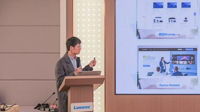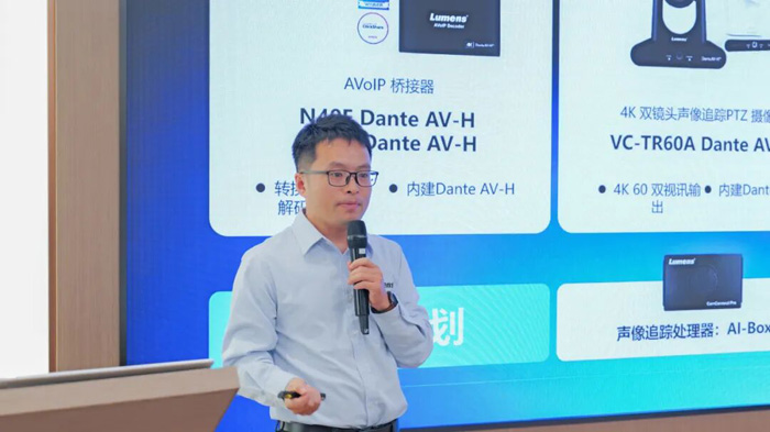 Lumens技術(shù)部總監(jiān)-竇郢壇,則為大家揭秘了《Lumens AI會(huì)議室創(chuàng)新方案》,并為大家講解現(xiàn)場(chǎng)方案體驗(yàn)區(qū)規(guī)劃。