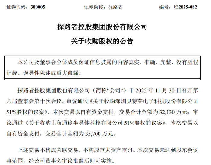 探路者控股集團(tuán)股份有限公司12 月 1 日公告,擬以自有資金合計(jì) 6.783 億元收購(gòu)兩家半導(dǎo)體企業(yè)各 51% 股權(quán),分別以 3.213 億元收購(gòu)深圳貝特萊電子科技股份有限公司(簡(jiǎn)稱(chēng) "貝特萊")51% 股權(quán),以 3.57 億元收購(gòu)上海通途半導(dǎo)體科技有限公司(簡(jiǎn)稱(chēng) "上海通途")51% 股權(quán)。此次交易標(biāo)志著這家傳統(tǒng)戶外用品企業(yè)全面切入半導(dǎo)體賽道,構(gòu)建 "感知交互 + 顯示處理" 的芯片產(chǎn)業(yè)布局。