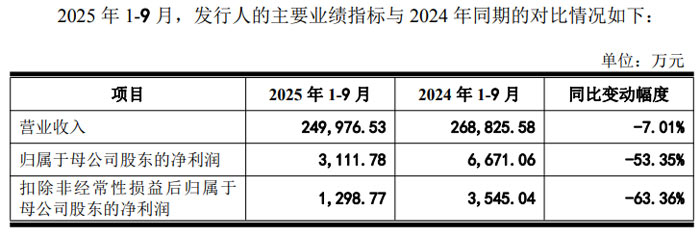 財務數據顯示,報告期內公司營業(yè)收入及歸母凈利潤呈階段性下滑態(tài)勢。2022 年度至 2024 年度,公司營業(yè)收入分別為 357,988.57 萬元、354,163.72 萬元、347,286.03 萬元,歸屬于母公司股東的凈利潤分別為 12,133.98 萬元、8,563.53 萬元、5,153.01 萬元;2025 年 1-9 月,營業(yè)收入進一步降至 249,976.53 萬元,同比下降 7.01%,歸母凈利潤 3,111.78 萬元,同比下降 53.35%。