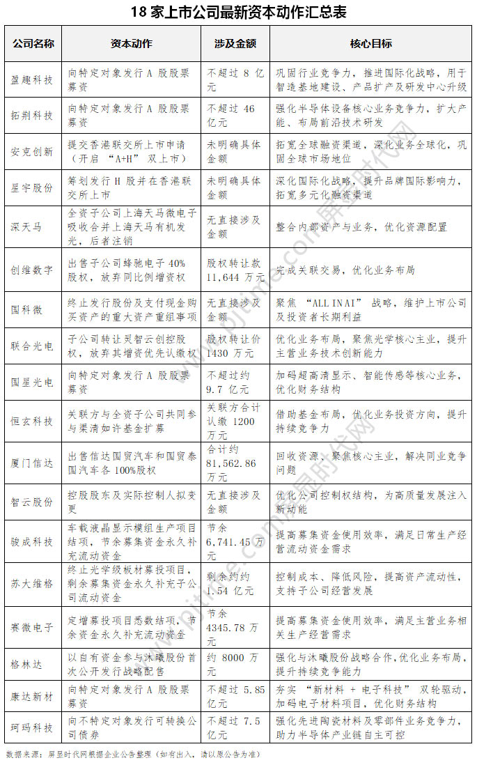 近期,電子信息與半導(dǎo)體顯示制造領(lǐng)域迎來資本動作密集期——盈趣科技、安克創(chuàng)新、星宇股份、深天馬、創(chuàng)維數(shù)字、國科微、聯(lián)合光電、國星光電、恒玄科技、廈門信達(dá)、智云股份、駿成科技、蘇大維格、賽微電子、格林達(dá)、康達(dá)新材、珂瑪科技、拓荊科技18家上市公司披露資本運作最新動向。從海外產(chǎn)能擴建、核心技術(shù)研發(fā)到全球化上市布局,一系列精準(zhǔn)施策的資本舉措,勾勒出行業(yè)龍頭錨定主業(yè)、搶占先機的清晰路徑。
