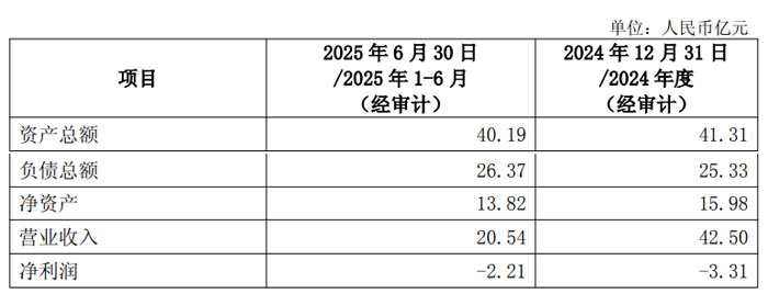 經(jīng)審計(jì)的核心財(cái)務(wù)數(shù)據(jù)如下:2025 年 6 月 30 日,標(biāo)的公司資產(chǎn)總額 40.19 億元人民幣,負(fù)債總額 26.37 億元人民幣,凈資產(chǎn) 13.82 億元人民幣;2025 年 1-6 月,實(shí)現(xiàn)營(yíng)業(yè)收入 20.54 億元人民幣,凈利潤(rùn) - 2.21 億元人民幣。2024 年 12 月 31 日,標(biāo)的公司資產(chǎn)總額 41.31 億元人民幣,負(fù)債總額 25.33 億元人民幣,凈資產(chǎn) 15.98 億元人民幣;2024 年度實(shí)現(xiàn)營(yíng)業(yè)收入 42.50 億元人民幣,凈利潤(rùn) - 3.31 億元人民幣。