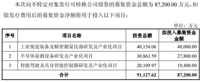 本次募集資金扣除發(fā)行費用后,將全部投入三大產(chǎn)業(yè)化項目:工業(yè)視覺裝備及精密測量儀器研發(fā)及產(chǎn)業(yè)化項目(擬投入 4.00 億元)、半導(dǎo)體量測設(shè)備研發(fā)及產(chǎn)業(yè)化項目(擬投入 2.78 億元)、智能駕駛及具身智能控制器研發(fā)及產(chǎn)業(yè)化項目(擬投入 1.94 億元)。