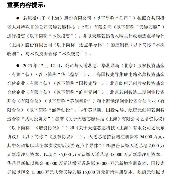 2025 年 12 月 13 日,芯原微電子 (上海) 股份有限公司(證券代碼:688521,證券簡(jiǎn)稱:芯原股份)發(fā)布公告,披露聯(lián)合投資方共同對(duì)外投資暨收購(gòu)逐點(diǎn)半導(dǎo)體(上海)股份有限公司(簡(jiǎn)稱 “逐點(diǎn)半導(dǎo)體”)的最新進(jìn)展。公司已與華芯鼎新、國(guó)投先導(dǎo)等五家共同投資方簽署增資及股東相關(guān)協(xié)議,通過(guò)對(duì)特殊目的公司天遂芯愿科技 (上海) 有限公司(簡(jiǎn)稱 “天遂芯愿”)增資,推進(jìn)逐點(diǎn)半導(dǎo)體控制權(quán)收購(gòu)事宜。
