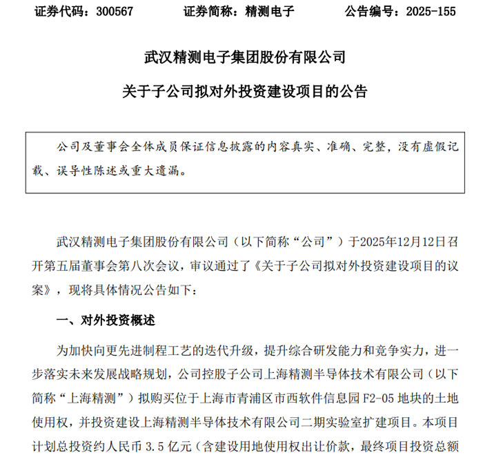 2025 年 12 月 12 日,武漢精測(cè)電子集團(tuán)股份有限公司(證券代碼:300567,證券簡(jiǎn)稱:精測(cè)電子)發(fā)布公告稱,公司第五屆董事會(huì)第八次會(huì)議審議通過(guò)相關(guān)議案,同意控股子公司上海精測(cè)半導(dǎo)體技術(shù)有限公司(以下簡(jiǎn)稱 “上海精測(cè)”)擬以公開(kāi)競(jìng)拍方式購(gòu)買土地使用權(quán),并投資建設(shè)二期實(shí)驗(yàn)室擴(kuò)建項(xiàng)目,計(jì)劃總投資約 3.5 億元。