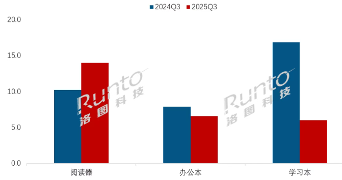 品類發(fā)展明顯分化:閱讀器持續(xù)擔(dān)當(dāng)市場的核心增長引擎。洛圖科技(RUNTO)消費者行為調(diào)研結(jié)果顯示,市場回暖的核心驅(qū)動力源于用戶需求的理性回歸,自律人群、專業(yè)閱讀群體的核心訴求重新主導(dǎo)市場;辦公本逐漸滲透入大眾辦公場景,成為輕量化辦公的 “剛需搭子”;學(xué)習(xí)本在同比高基數(shù)和電子紙顯示用戶納新放緩的影響下,規(guī)模顯著衰退。
