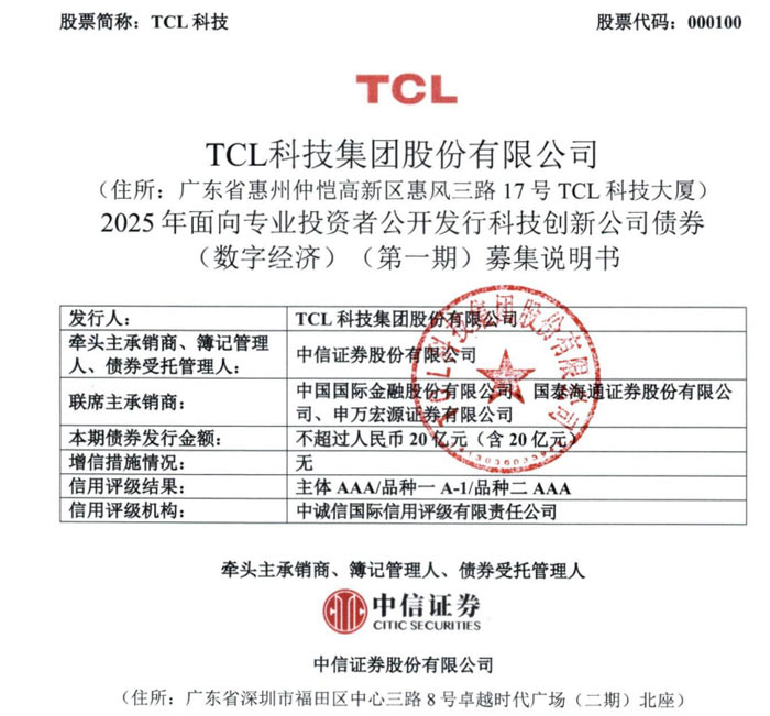 近日,TCL 科技集團股份有限公司(股票簡稱:TCL 科技,股票代碼:000100)披露《2025 年面向專業(yè)投資者公開發(fā)行科技創(chuàng)新公司債券 (數(shù)字經(jīng)濟)(第一期) 募集說明書》,計劃發(fā)行不超過 20 億元(含 20 億元)的科技創(chuàng)新公司債券,募集資金扣除發(fā)行費用后將用于償還公司有息債務。