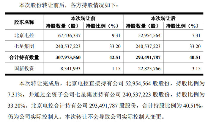 從持股結(jié)構(gòu)變動(dòng)來(lái)看,轉(zhuǎn)讓前北京電控直接持股 67,436,337 股(9.31%),與七星集團(tuán)合計(jì)持股 307,973,560 股(42.51%);國(guó)新投資此前持有 8,341,993 股(1.15%),受讓完成后持股數(shù)量增至 22,823,766 股,持股比例提升至 3.15%。公告明確,北京電控與國(guó)新投資之間不存在股權(quán)、人員等關(guān)聯(lián)關(guān)系,亦無(wú)其他經(jīng)濟(jì)利益關(guān)聯(lián)。