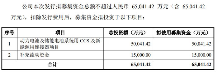 募集資金中,50,041.42 萬(wàn)元將投入 “動(dòng)力電池及儲(chǔ)能電池系統(tǒng)用 CCS 及新能源用連接器項(xiàng)目”,項(xiàng)目達(dá)產(chǎn)后將新增年產(chǎn) CCS 模組 500 萬(wàn)套和新能源用連接器 4800 萬(wàn)個(gè),進(jìn)一步擴(kuò)大公司在新能源領(lǐng)域的產(chǎn)能規(guī)模;15,000 萬(wàn)元用于補(bǔ)充流動(dòng)資金,將有效優(yōu)化公司資金結(jié)構(gòu),支撐主營(yíng)業(yè)務(wù)持續(xù)發(fā)展。