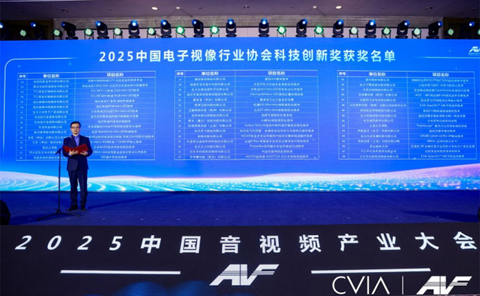 中國電子視像行業(yè)協(xié)會執(zhí)行會長郝亞斌先生和秘書長董敏先生分別揭曉了獲得2025年度中國音視頻產(chǎn)業(yè)“彩虹獎”和“科技創(chuàng)新獎”的人物和創(chuàng)新成果名單。