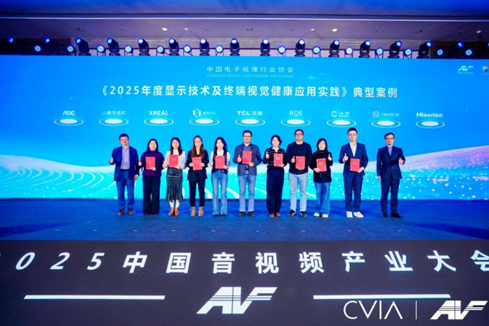 中國電子視像行業(yè)協(xié)會秘書長董敏和溫州醫(yī)科大學(xué)附屬眼視光醫(yī)院教授、國家眼視光工程技術(shù)研究中心常務(wù)副主任陳浩共同啟動了發(fā)布儀式,并為此次入選的“2025年度顯示技術(shù)及終端視覺健康應(yīng)用實(shí)踐典型案例”的企業(yè)代表頒發(fā)證書。