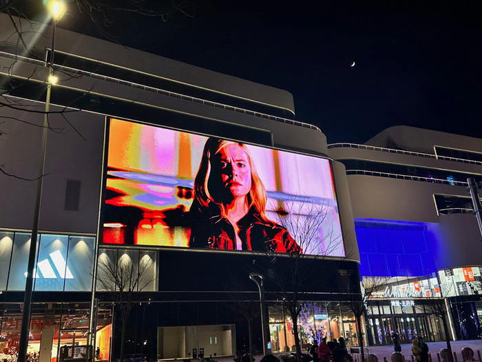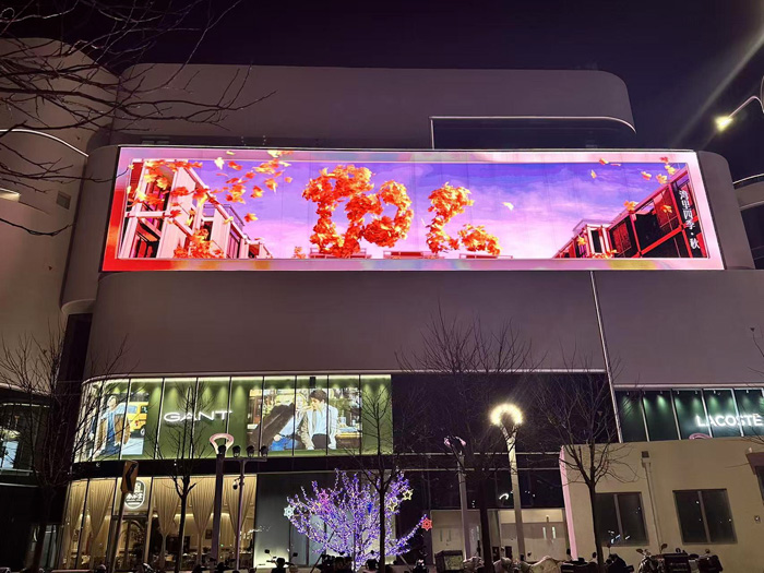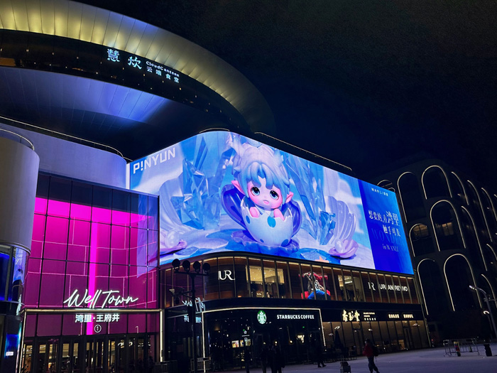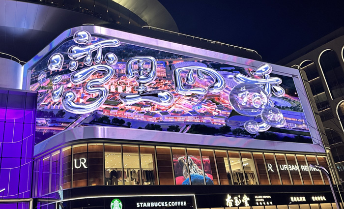 還未步入商場(chǎng),極具科技感的樓體便已先聲奪人,室外裸眼3D大屏以震撼的視覺沖擊力,成為項(xiàng)目極具辨識(shí)度的視覺符號(hào),不僅承擔(dān)著夜景亮化的重任,更展現(xiàn)了灣里·王府井WellTown的品牌形象。