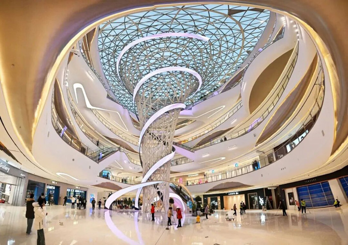 商城1號(hào)中庭的光影之境,成為特色打卡點(diǎn),吸引眾多消費(fèi)者駐足。LED炫彩光帶以柔性顯示形態(tài)螺旋纏繞,流動(dòng)的光影順著光帶直通穹頂,營(yíng)造出超級(jí)壯觀的空間視覺盛宴,將科技感與空間美學(xué)完美融合,帶來(lái)前所未有的視覺享受。