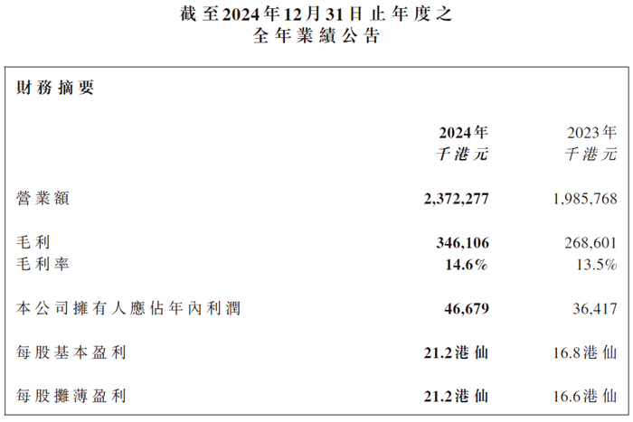 2024年度,偉志控股有限公司(股份代號:1305.HK)總收入約為23.72億港元,較2023年同期的約19.86億港元增加19.5%。核心業(yè)務(wù)(即LED背光及LED照明產(chǎn)品)收入約為20.84億港元,較截至2023 年12 月31日止年度的約17.77億港元增加17.3%。LED背光產(chǎn)品的銷售收入約為19.58億港元(2023 年:約16.56億港元),增加18.2%,此乃主要由于車載顯示器LED背光產(chǎn)品的銷售額不斷增加。LED照明產(chǎn)品的銷售收入約為1.26億港元(2023 年:約1.20億港元),輕微增加4.4%,乃由于中國公立學(xué)校系統(tǒng)內(nèi)的照明計劃的收入帶動。報告期內(nèi),歸母凈利潤4667.9萬港元。