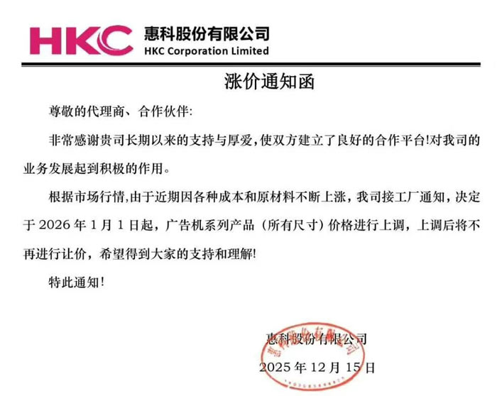 2025年12月中旬以來,不到一個月的時間,顯示行業(yè)已經(jīng)有近20家企業(yè)發(fā)布“漲價”函,包括創(chuàng)維商用、惠科股份、兆馳股份、大華股份、鴻利智匯、中麒光電、鑫彩晨!一股成本上漲、價格提升的暗潮正在行業(yè)上下游產(chǎn)業(yè)鏈“涌動”!