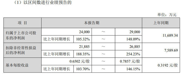 業(yè)績預(yù)告期間為 2025 年 1 月 1 日至 12 月 31 日,經(jīng)公司財(cái)務(wù)部門初步測(cè)算,報(bào)告期內(nèi)公司歸屬于上市公司股東的凈利潤預(yù)計(jì)為 24,000 萬元至 29,000 萬元,較上年同期的 11,689.34 萬元增長 105.32% 至 148.09%;扣除非經(jīng)常性損益后的凈利潤預(yù)計(jì)為 21,885 萬元至 26,885 萬元,較上年同期的 7,589.69 萬元大幅增長 188.35% 至 254.23%,增長幅度更為顯著。