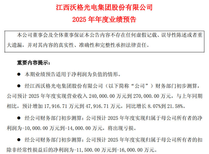 1 月 14 日,江西沃格光電集團(tuán)股份有限公司(證券代碼:603773,證券簡(jiǎn)稱(chēng):沃格光電)發(fā)布 2025 年年度業(yè)績(jī)預(yù)告。