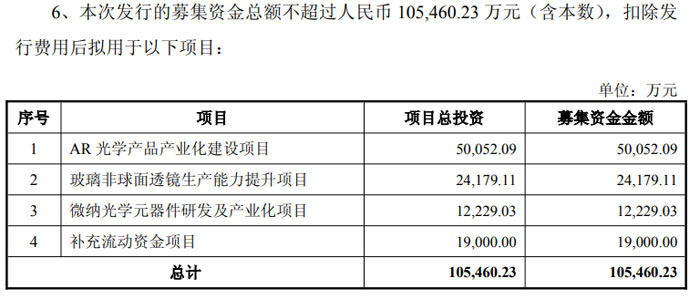 AR 光學(xué)產(chǎn)品產(chǎn)業(yè)化建設(shè)項(xiàng)目,投資 5.005 億元,用于擴(kuò)大 AR 領(lǐng)域產(chǎn)品批量化生產(chǎn)與交付能力,推進(jìn)技術(shù)成果轉(zhuǎn)化;
