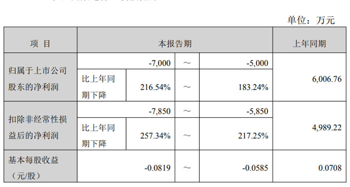 歸屬于上市公司股東的凈利潤:預(yù)計虧損 7000 萬元至 5000 萬元,上年同期為盈利 6006.76 萬元,同比下降 183.24% 至 216.54%;