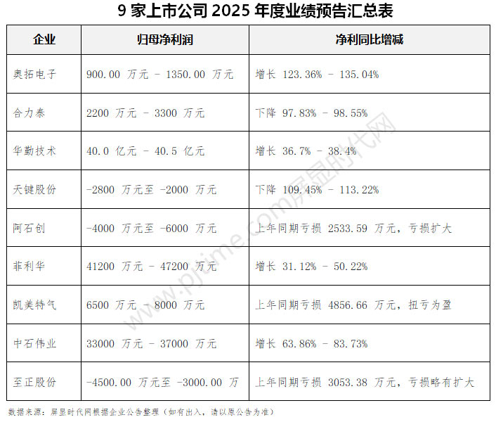近日,奧拓電子、合力泰、華勤技術(shù)、天鍵股份、阿石創(chuàng)、菲利華、凱美特氣、中石偉業(yè)、至正股份九家分屬 LED 顯示屏、電子紙、智能制造、半導(dǎo)體與顯示材料等領(lǐng)域的上市企業(yè)陸續(xù)披露2025年度業(yè)績預(yù)告。