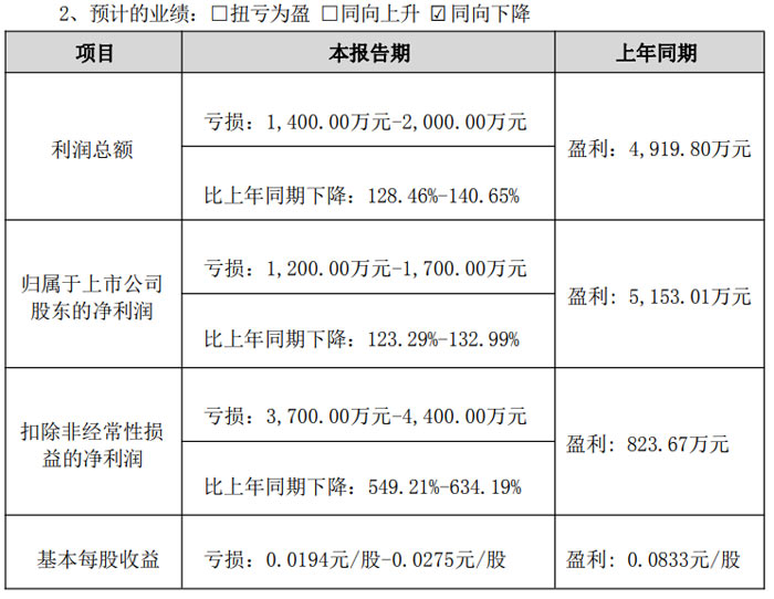 歸屬于上市公司股東的凈利潤預計虧損 1200.00 萬元 - 1700.00 萬元,上年同期為盈利 5153.01 萬元,同比下降 123.29%-132.99%;