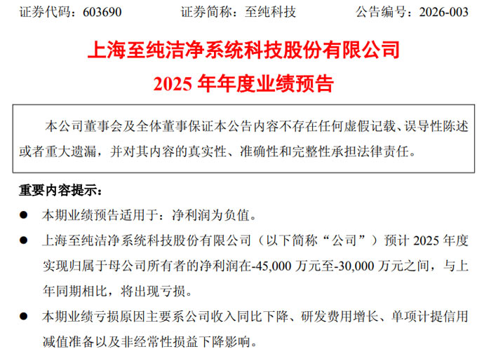 2026 年 1 月 26 日,上海至純潔凈系統(tǒng)科技股份有限公司(證券代碼:603690,證券簡稱:至純科技)發(fā)布 2025 年度業(yè)績預(yù)告公告(公告編號:2026-003)。公告顯示,公司 2025 年度預(yù)計出現(xiàn)業(yè)績虧損,核心受收入下滑、研發(fā)投入增加等多因素影響。