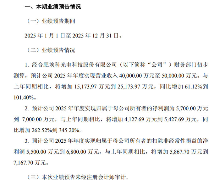 近日,合肥?乒怆娍萍脊煞萦邢薰荆ㄗC券代碼:688610,證券簡稱:?乒怆姡┌l(fā)布 2025 年年度業(yè)績預(yù)告。公司 2025 年經(jīng)營業(yè)績實現(xiàn)大幅突破。報告期內(nèi)(2025 年 1 月 1 日至 12 月 31 日),預(yù)計實現(xiàn)營業(yè)收入 40,000.00 萬元至 50,000.00 萬元,較上年同期的 24,826.03 萬元增加 15,173.97 萬元至 25,173.97 萬元,同比增幅達 61.12% 至 101.40%;